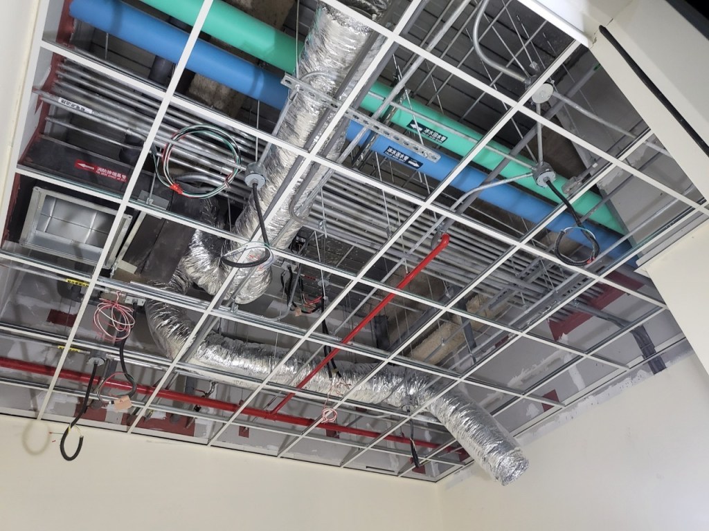 露出在天花板上的電線、空調管線等,為了整體美觀通常會施作明架天花板或暗架天花板遮擋起來。