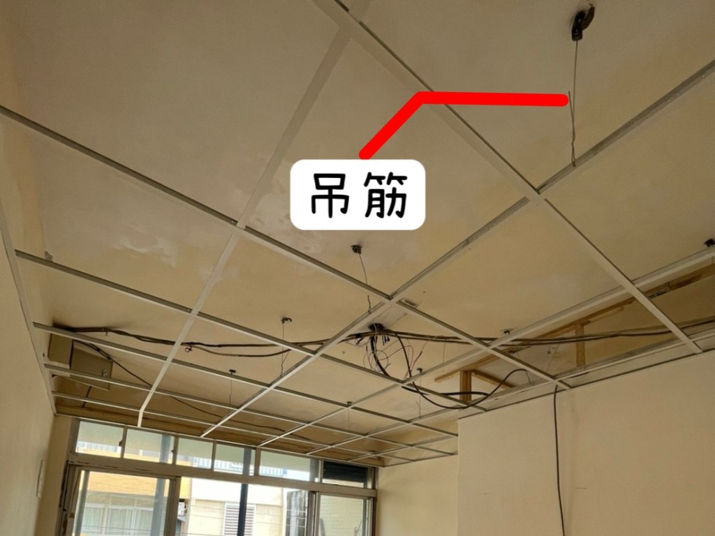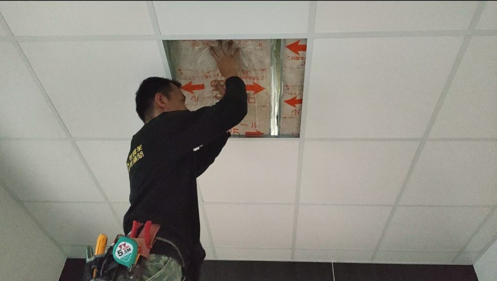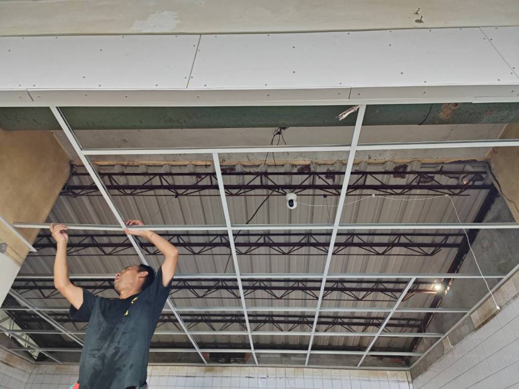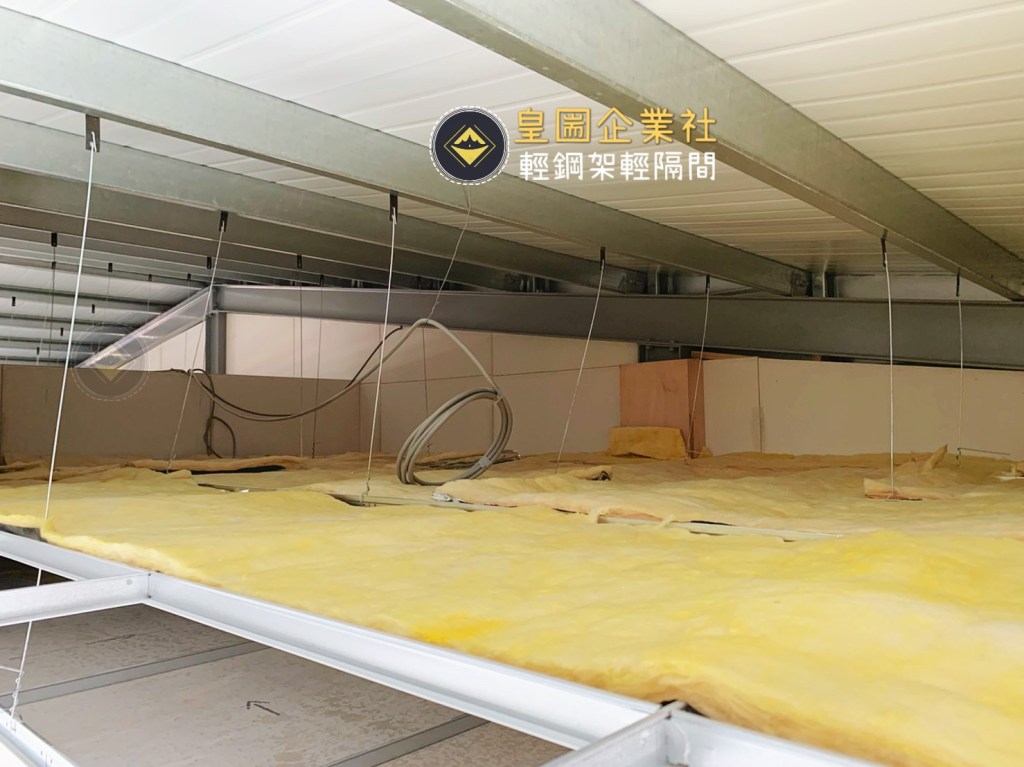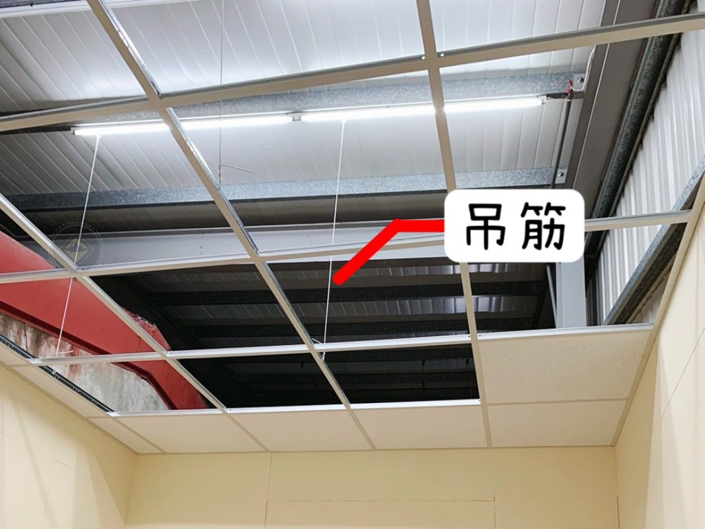此圖為鐵皮屋,業主為了增加隔熱度,施作雙層明架天花板並添加隔音隔熱防火岩棉。