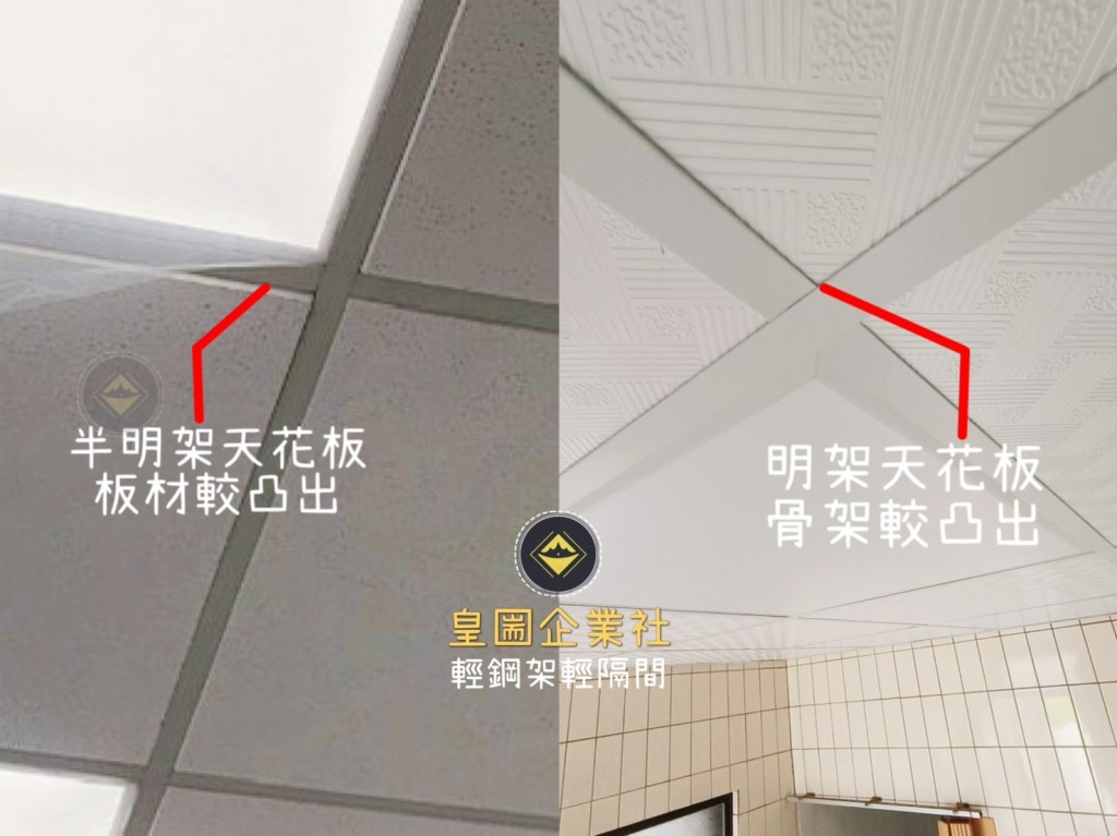 輕鋼架天花板還有分明架與半明架天花板,兩者施工方式相同、作用也相同,差別只在於: